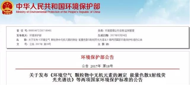 今年5月份,國(guó)家環(huán)境保護(hù)部批準(zhǔn)了《環(huán)境空氣 顆粒物中無(wú)機(jī)元素的測(cè)定 能量色散X射線熒光光譜法》(HJ 829-2017)和《環(huán)境空氣 顆粒物中無(wú)機(jī)元素的測(cè)定 波長(zhǎng)色散X射線熒光光譜法》(HJ830-2017)兩項(xiàng)標(biāo)準(zhǔn)為國(guó)家環(huán)境保護(hù)標(biāo)準(zhǔn),予以發(fā)布。